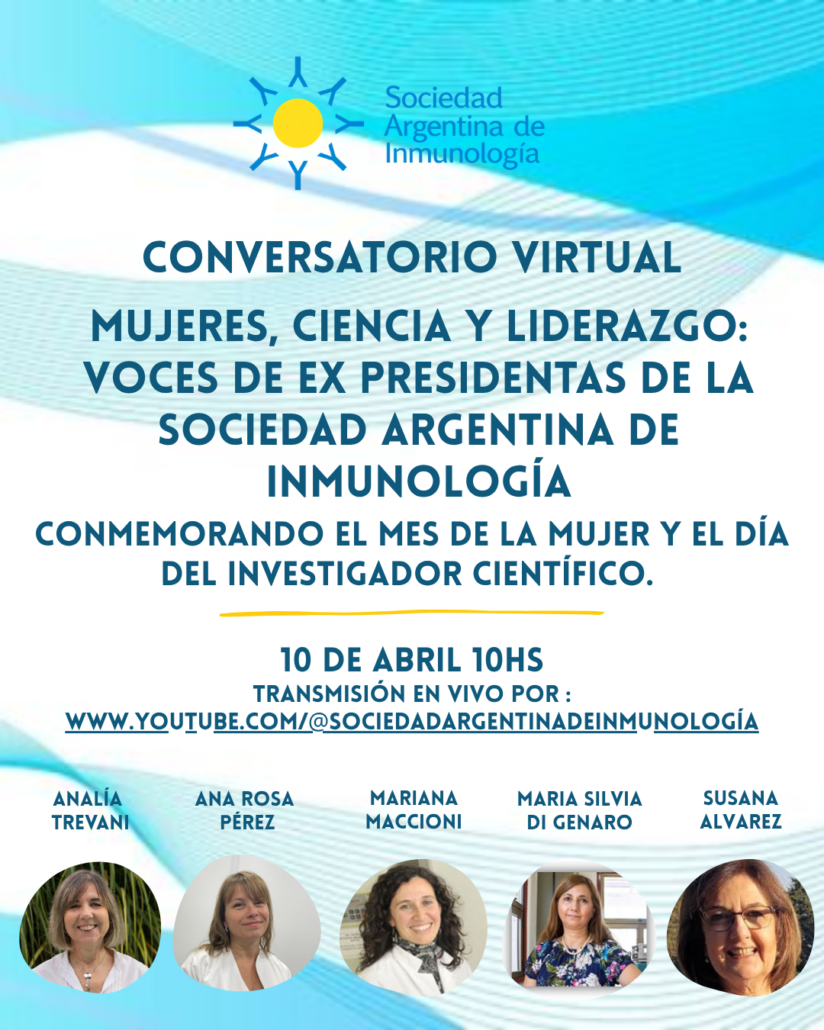 Nos alegra mucho escribirles para invitarlos a un encuentro muy especial: el próximo 10 de abril a las 10 h nos reuniremos en el canal de YouTube de la Sociedad para el conversatorio: “Mujeres, Ciencia y Liderazgo: Voces de Ex-presidentas de la Sociedad Argentina de Inmunología”.